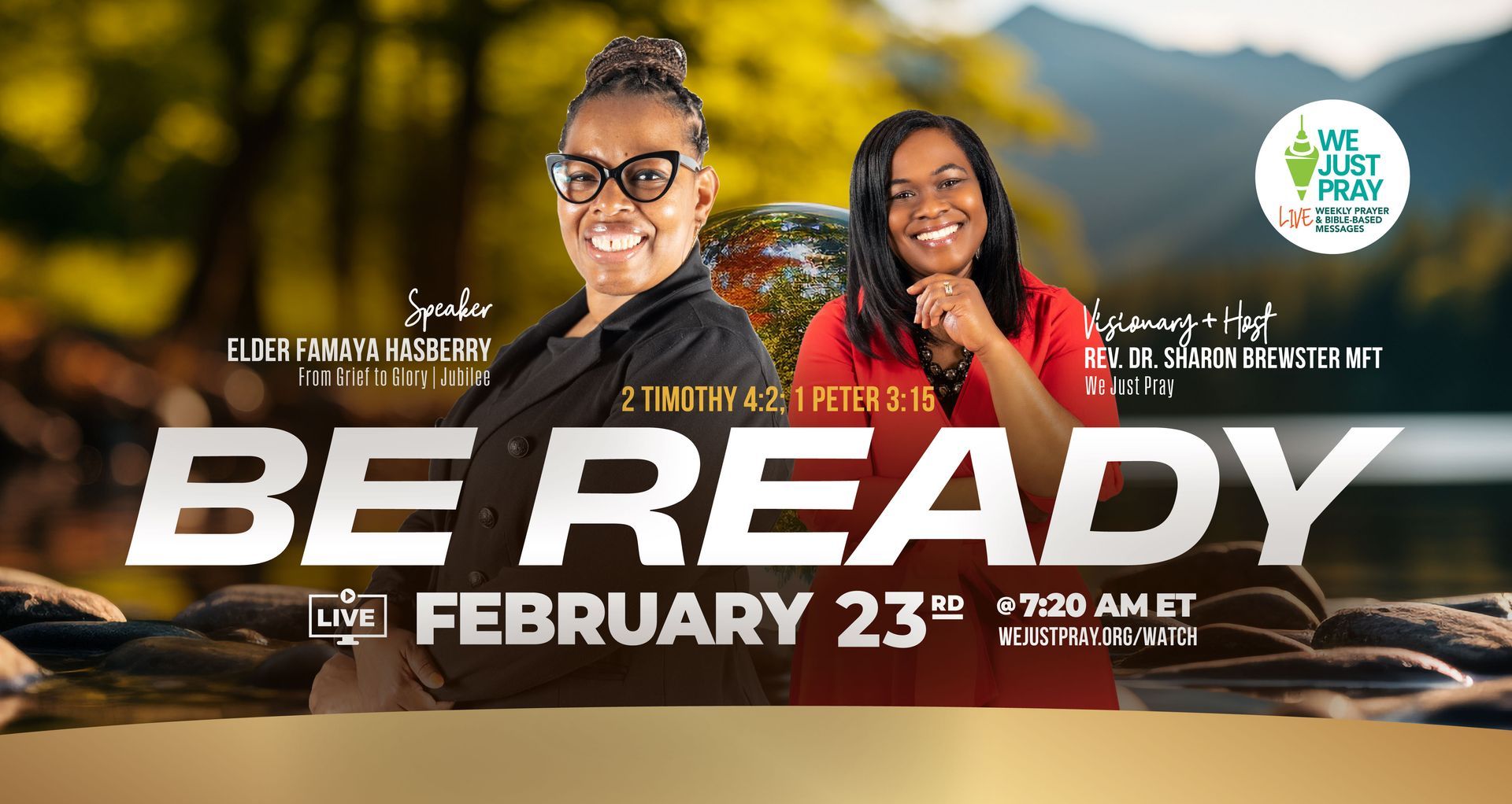 Thank you and welcome to We Just Pray. You'll receive a reminder email and/or text leading up to our next devotional or event. The next step in staying connected is to join our Facebook Group at: www.facebook.com/groups/wejustpray